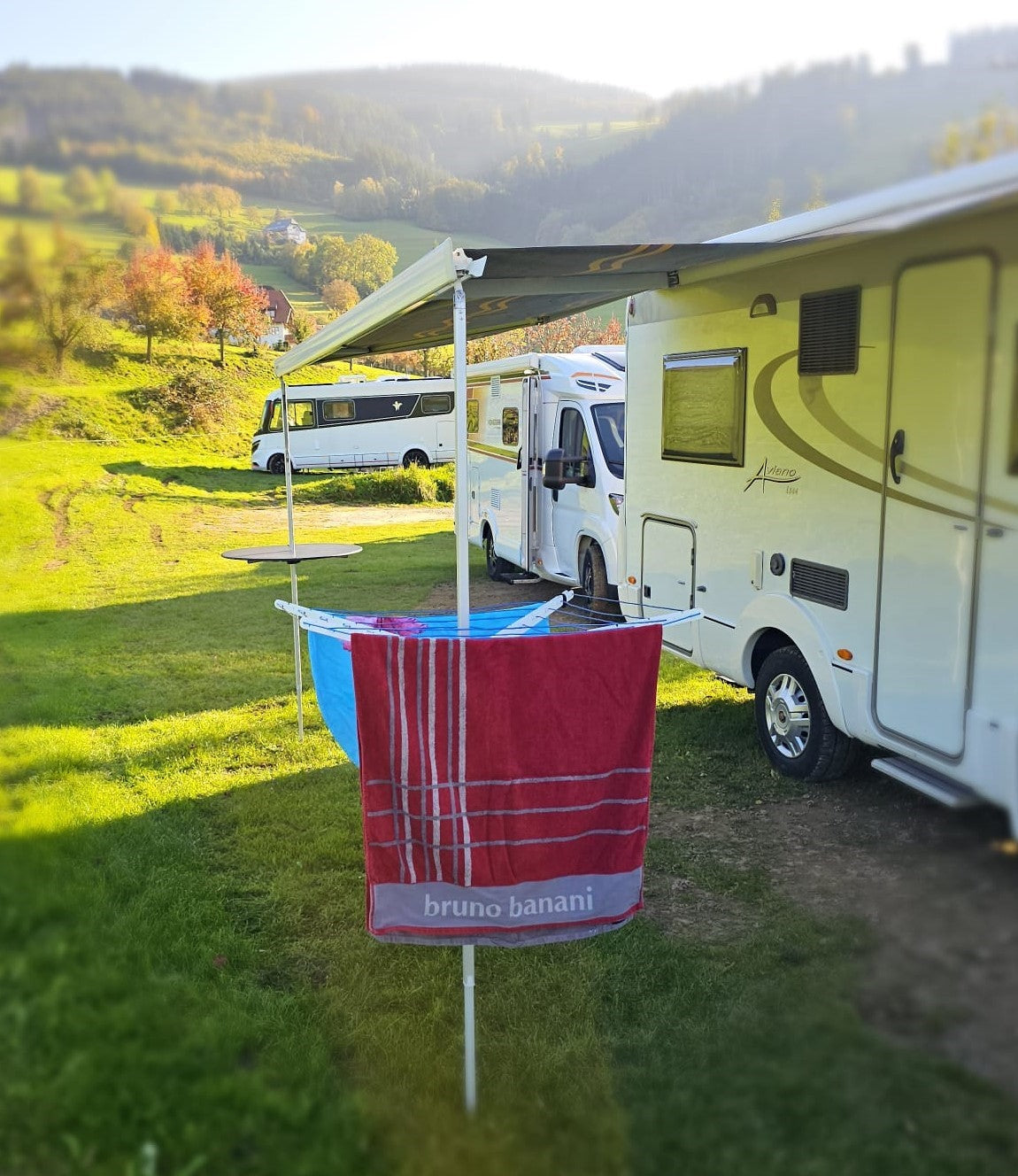 Der Markisen-Butler ist entweder eine Wäschespinne mit umlaufender Wäscheleine oder eine Kombination aus Wäschespinne und Stehtisch und wird blitzschnell an einem Stellfuß der Markise am Wohnmobil oder Wohnwagen montiert.